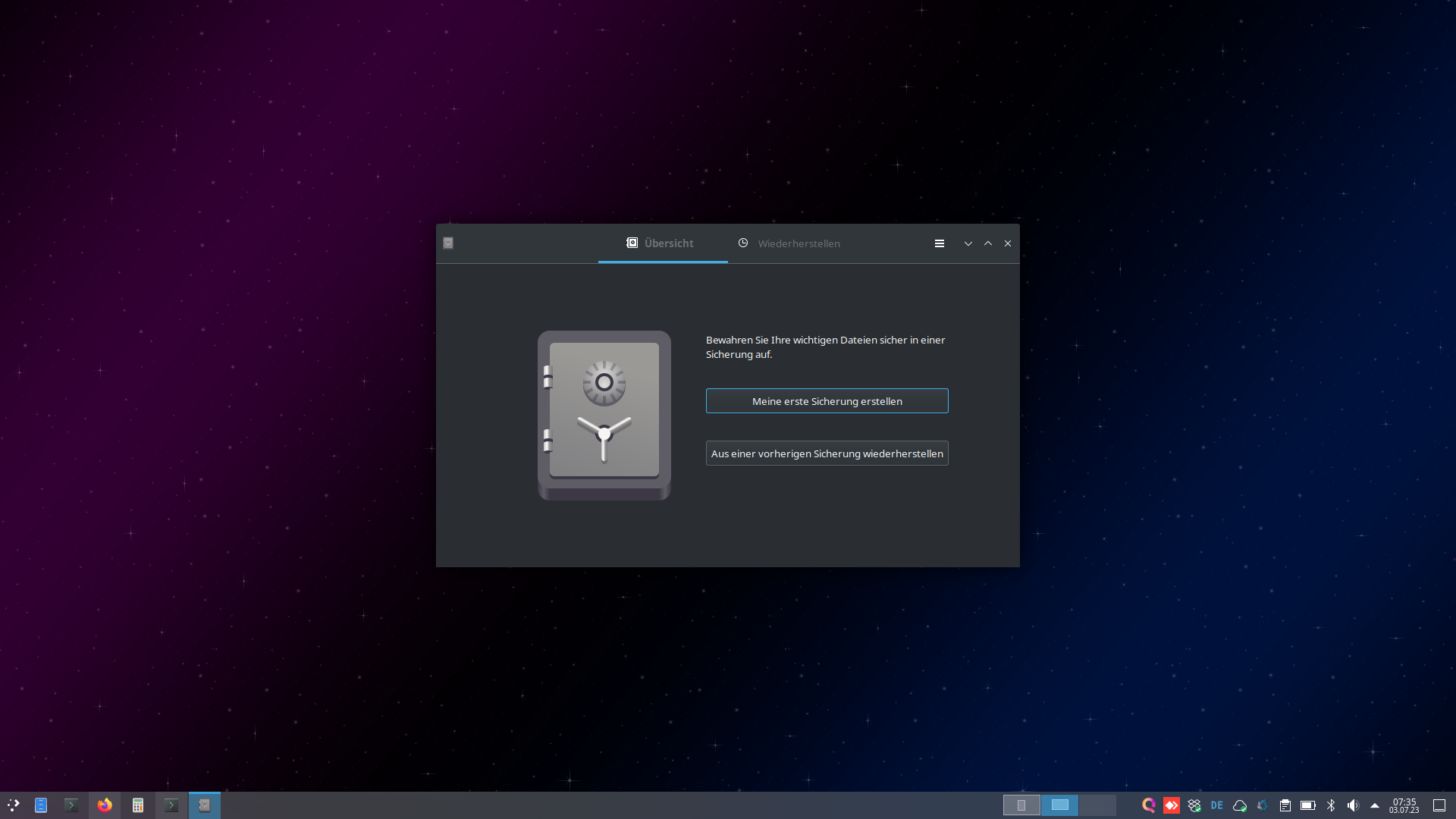 Du kannst das System einmal komplett absichern. Interessant, wenn du VM`s laufen hast. Oder wenn du ein Notebook oder ähnliches hast, dann einfach nur angegebene Verzeichnisse wie zum Beispiel das Home und so weiter sichern.