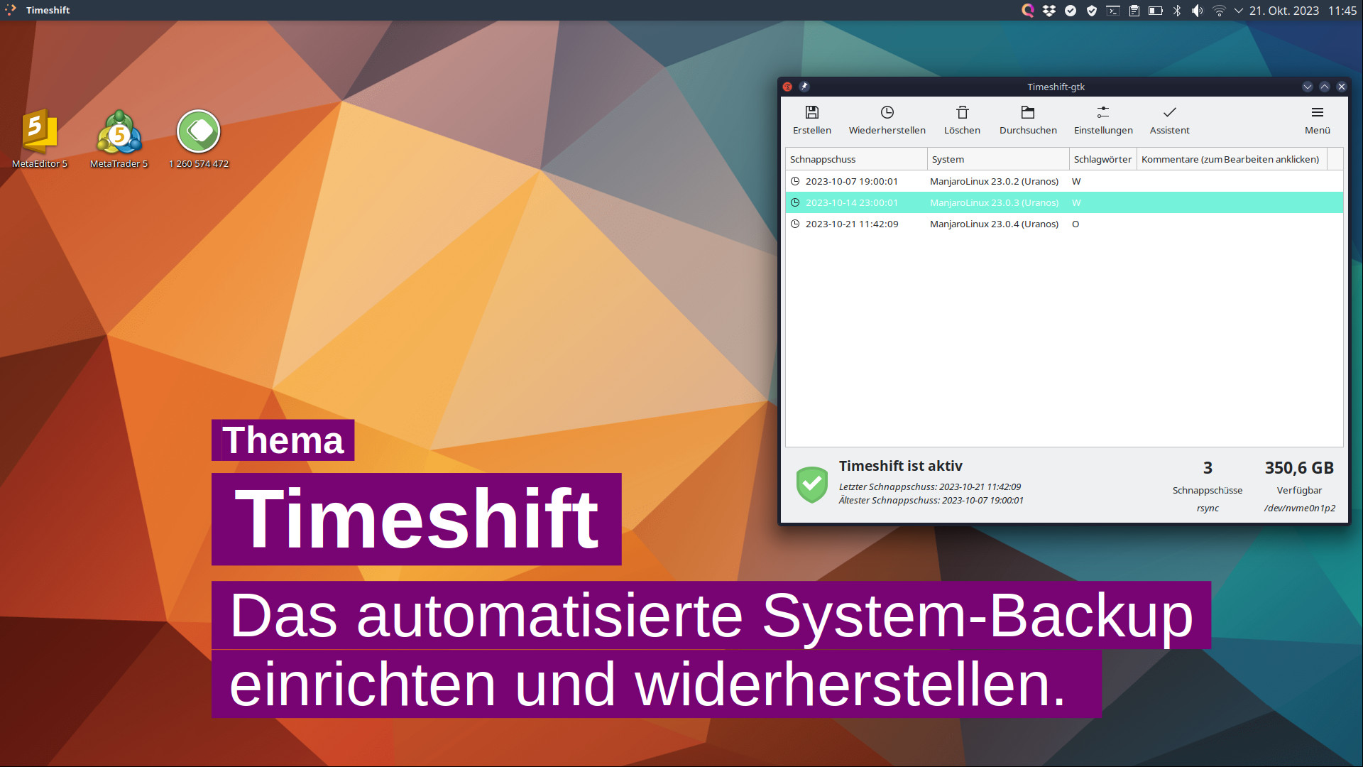 Wenn wieder einmal nach einem Update oder Upgrade etwas nicht funktioniert, weil der Treiber für etwas nicht mit der aktualisierten Version beispielsweise einen Konflikt ausgibt, dann hilft Timeshift. So richten Sie Backups automatisiert ein.