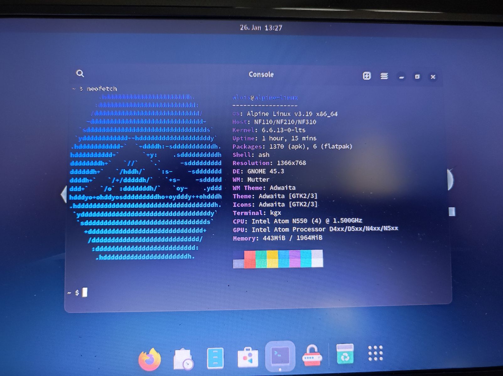 Als root anmelden und das SETUP (ähnlich Arch) mit setup-alpine starten und siehe da Gnome läuft butterweich auf der alten Maschine, die einen Speicherbedarf von nicht mal 443MB hat.