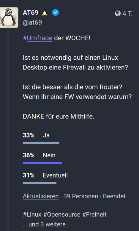 Ich habe auf Mastodon eine Umfrage gestartet ob Linux eine Firewall braucht oder nicht.