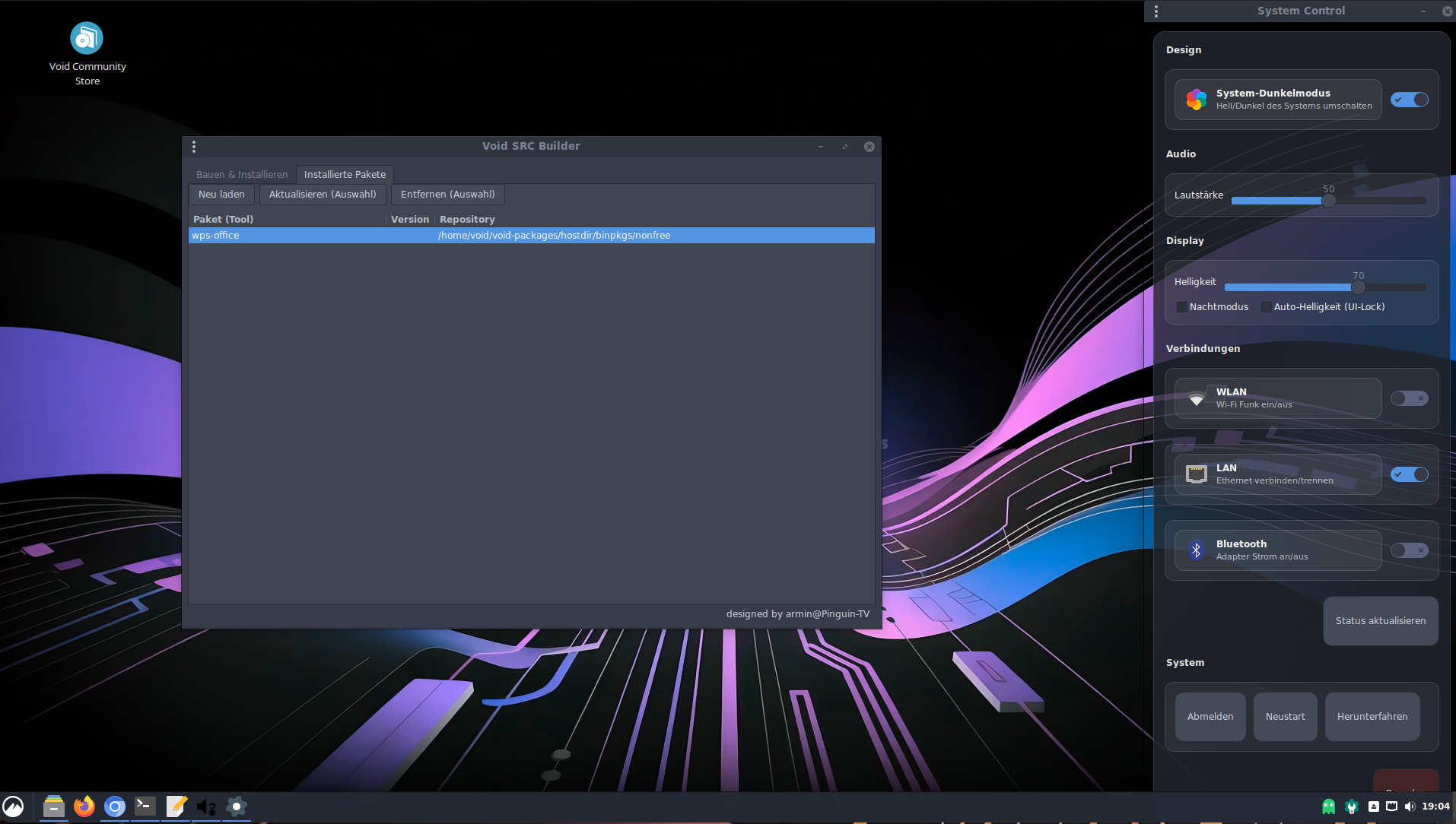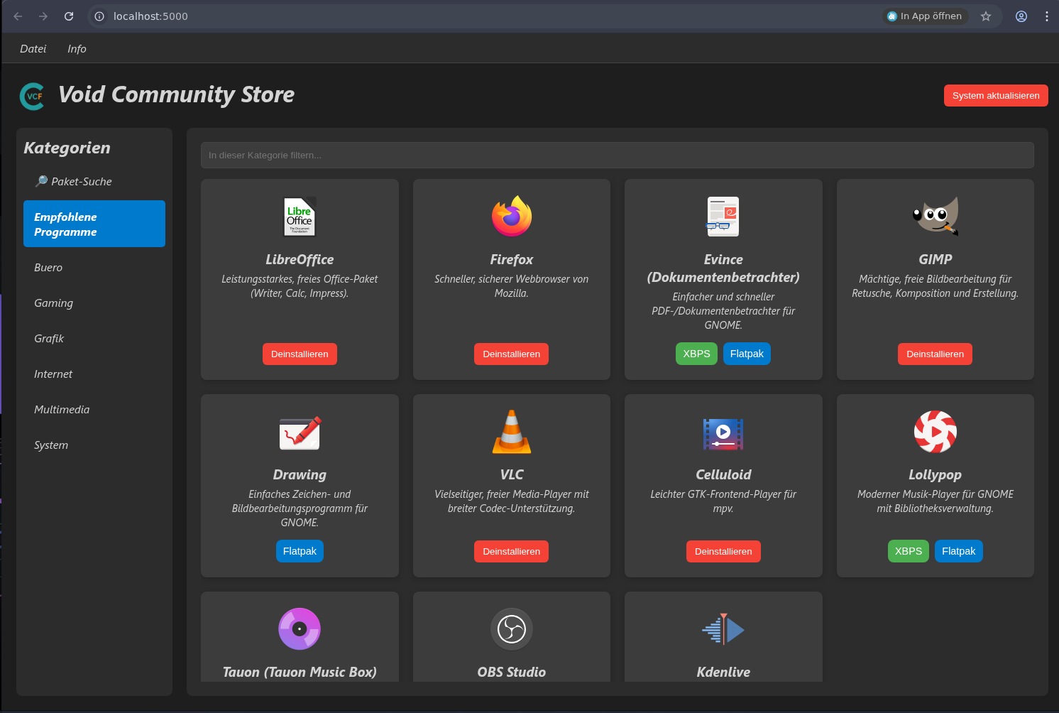 da zeige ich zum Schluss einen Software-Store der für Void das octoxbps ersetzt, und ist web-basierend! also läuft im Browser! also aus eurem Browser heraus das system updaten, Programme installieren usw. aber das ist noch nicht alles,