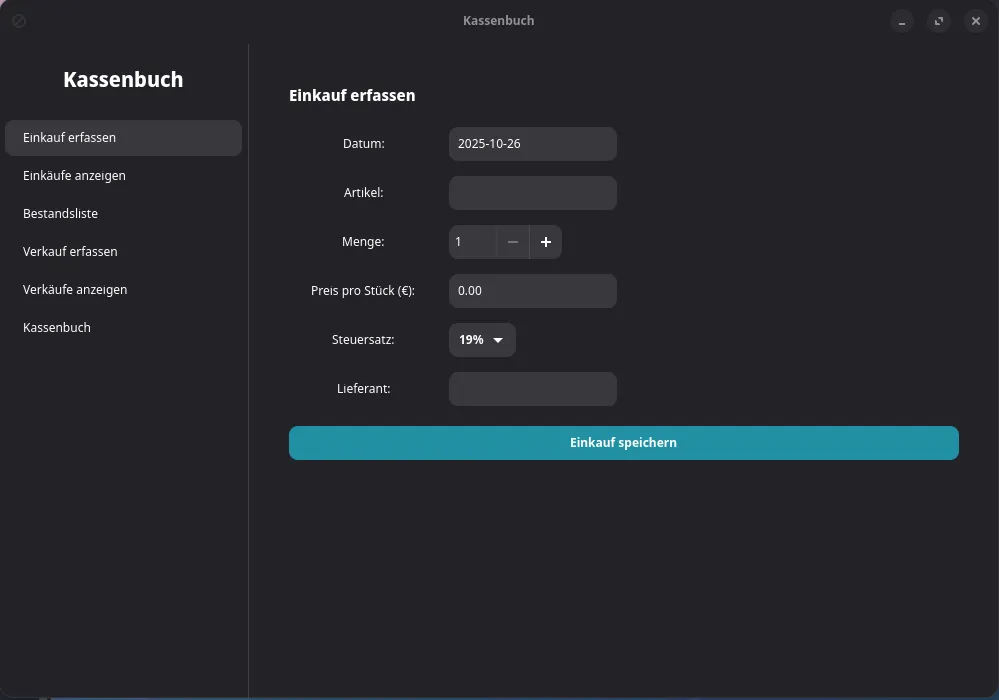 • ich möchte ein Kassenbuch für Linux erstellen, nachdem ich selber eins benötige und das ganze bisher mit Libreoffice gemacht habe dachte ich mir ich probier mal das ganze als App zu bauen.