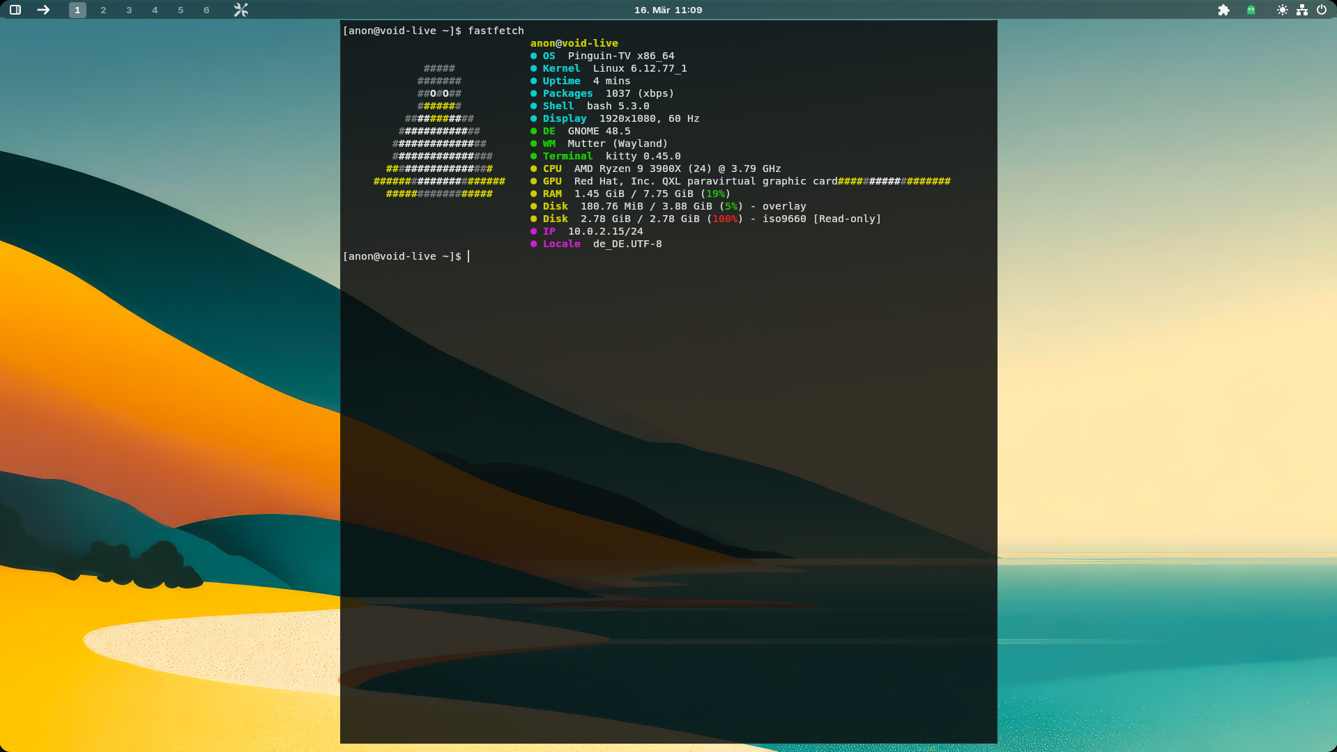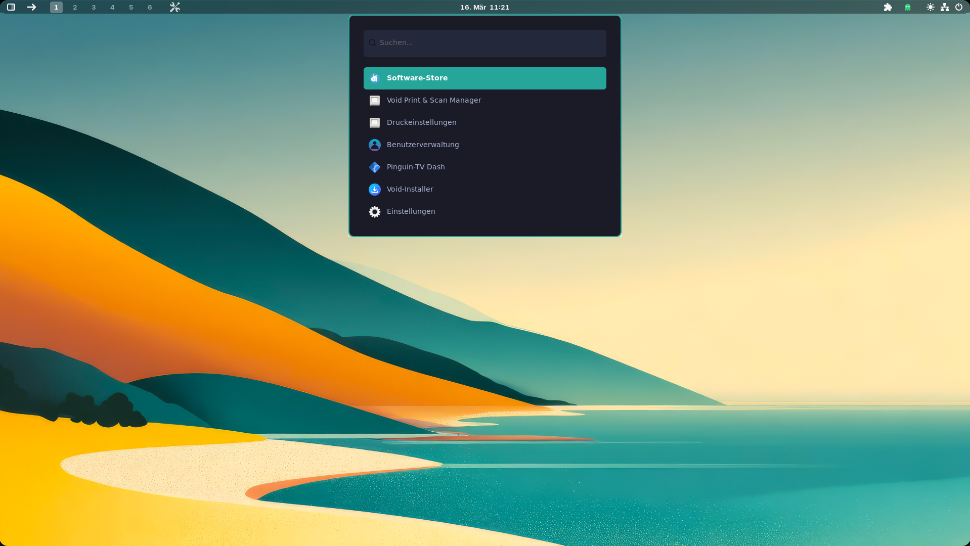 Desktop und Fenster ohne Leiste (Links oben die Zahlen sind Workspace, in diesem Fall 6), der Pfeil davor ist die Richtung wo das nächste Fenster geöffnet wird,
