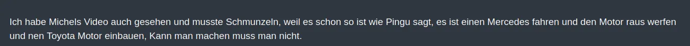 Ich habe Michels Video auch gesehen und musste Schmunzeln, weil es schon so ist wie Pingu sagt, es ist einen Mercedes fahren und den Motor raus werfen und nen Toyota Motor einbauen, Kann man machen muss man nicht.
