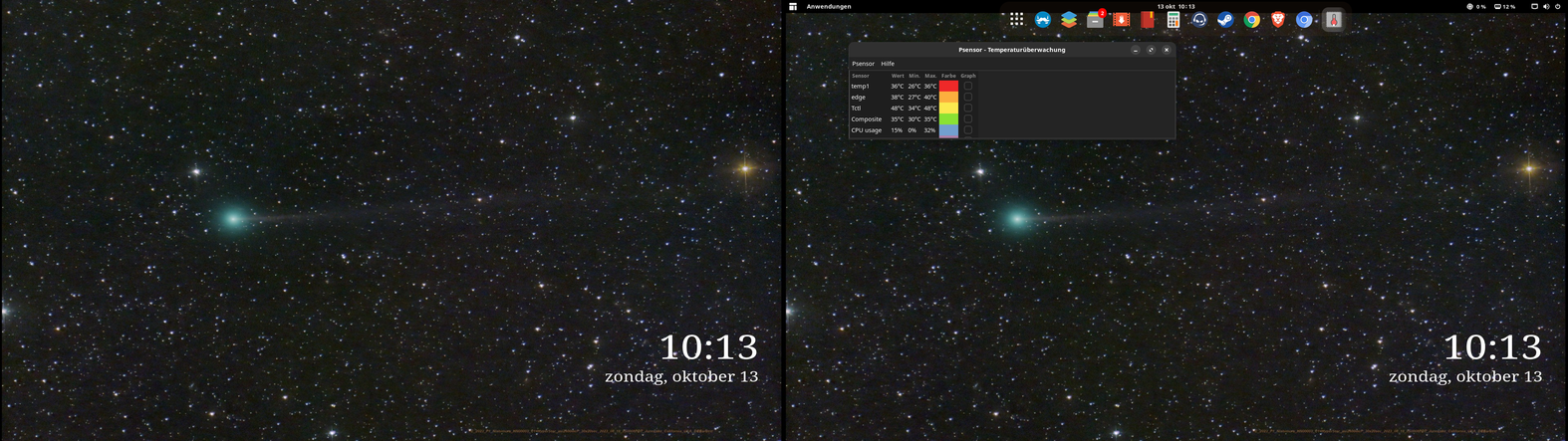 @juppsupp Ich wusste das mit dem Graph bei PSensor und mag ich keine Graphen, am besten klappt P-Sensor mit Hardware indicator App da kannst Du Dir dann oben in der Leiste Temps anzeigen lassen, aber diese Programm wüsste ich nicht wie ich es bei Manjaro an laufen bekommen sollte, ist aber auch nicht wirklich wichtig.