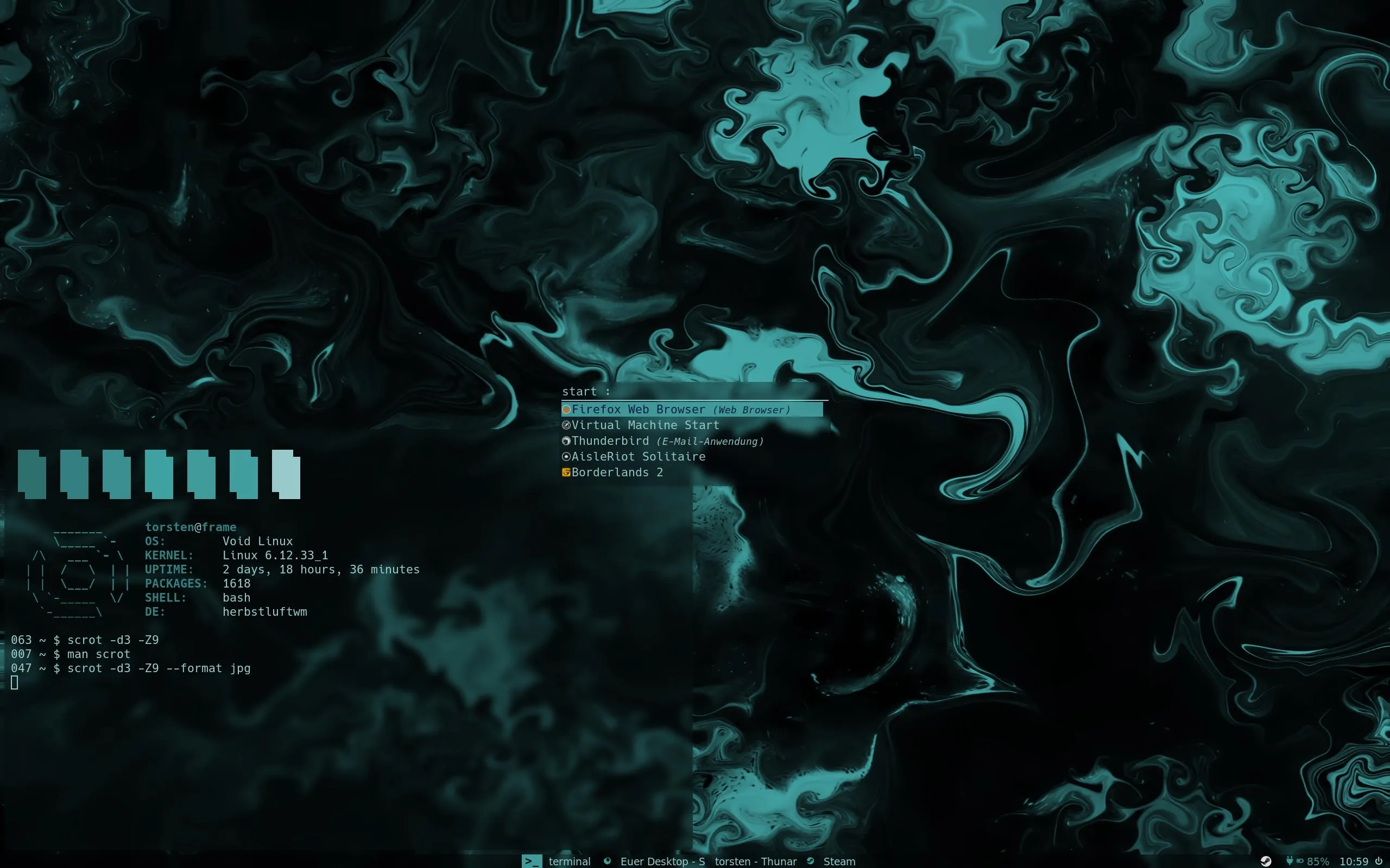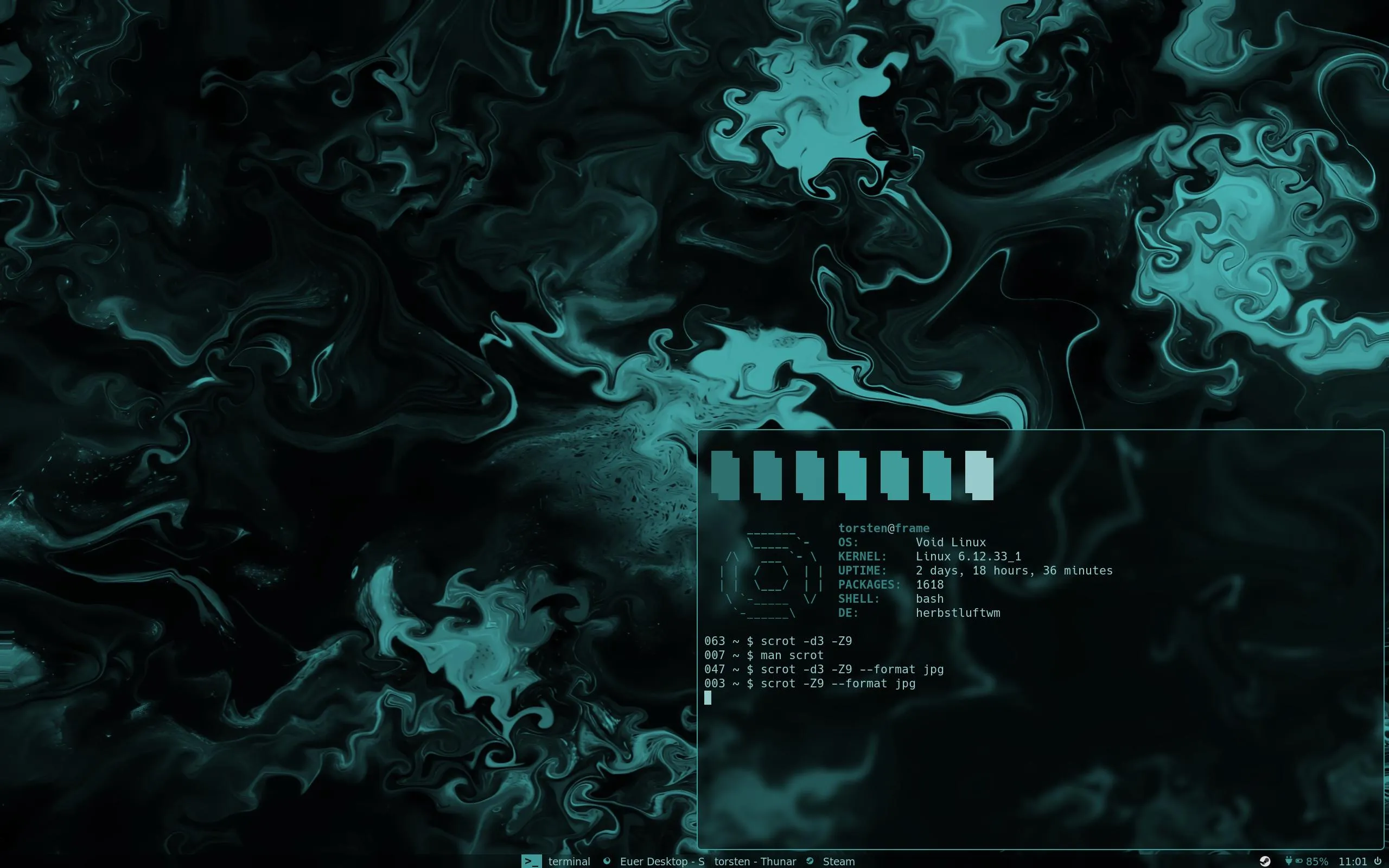 mein screenshot script mit scrot für zwei keyboard shortcuts, einmal ohne shift, einmal mit, einmal für den ganzen bildschirm, einmal zum selbst markieren, danach fragt er mich, ob ich das bild selbst speichern will oder hochladen und den link ausgeben