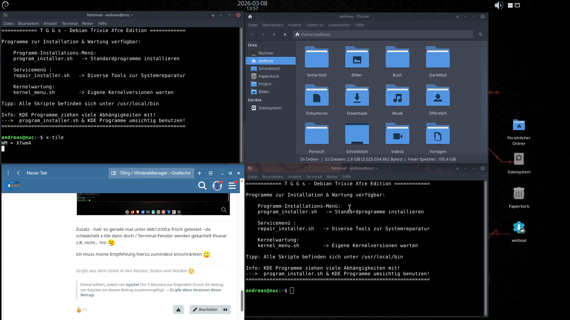 Zusatz - hab' es gerade mal unter deb13/Xfce frisch getestet - da schwächelt x-tile dann doch / Terminal-Fenster werden gekachelt thunar z.B. nicht... hm