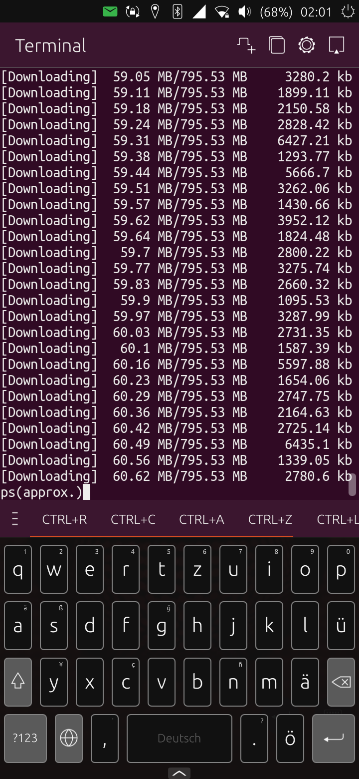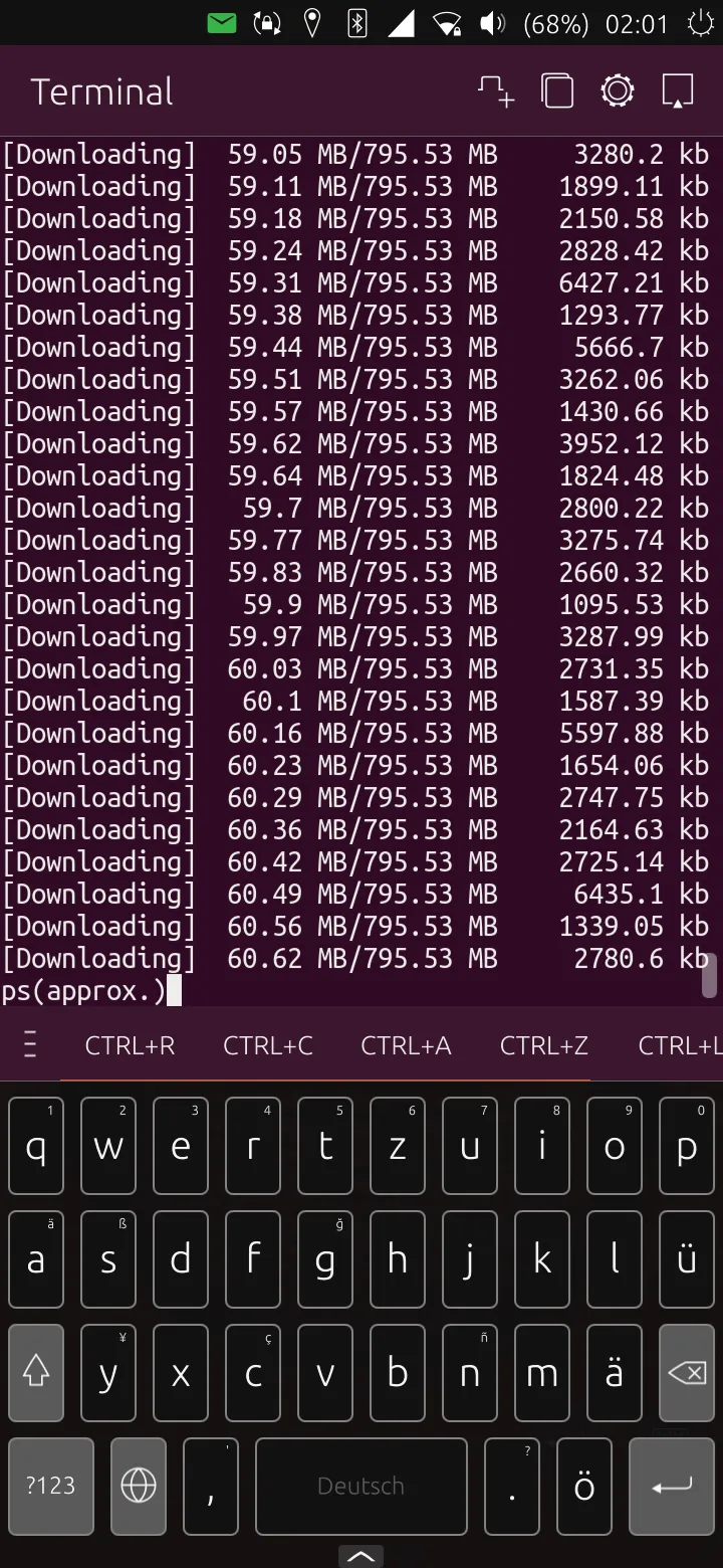 Terminal öffnen und "sudo waydroid upgrade" eintipseln. Nicht erschrecken - es ballern mal eben knapp 800 MB durch, dann 35 hinterher: