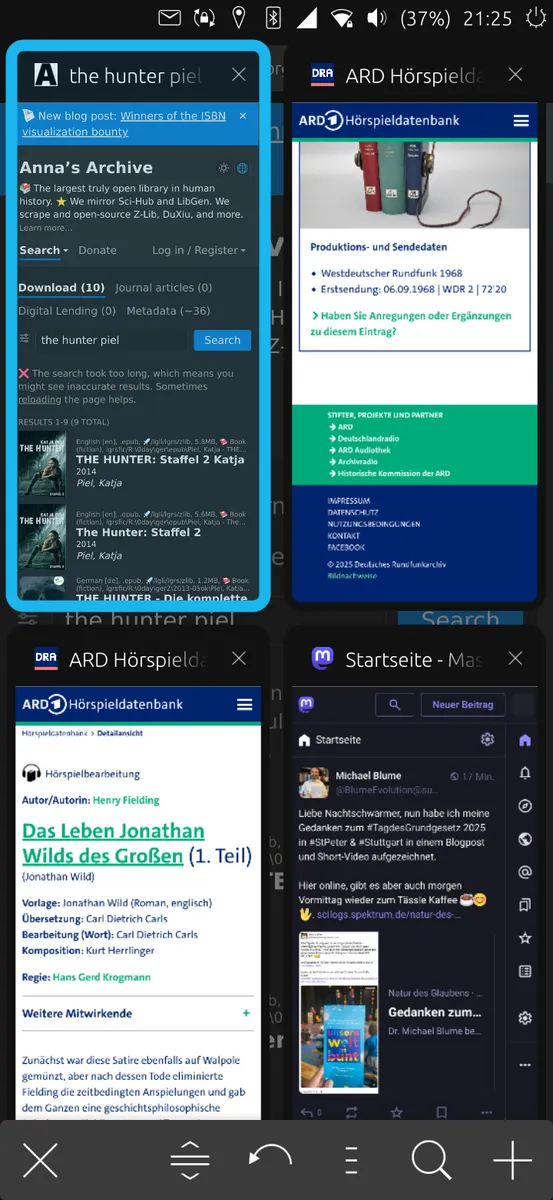 Der Browser verfügt über eine tolle Kachelansicht v. geöffneten bzw. gespeicherten Reitern (siehe Bild), und auch der Download klappt, im Gegensatz zum Obigen, sehr gut. Allg. ist dies ein recht gelungener Browser, wie ich finde, wobei "kleine Schwächen" schon zu finden sind wenn man danach sucht^^.