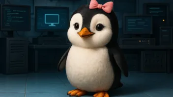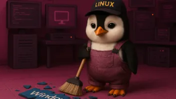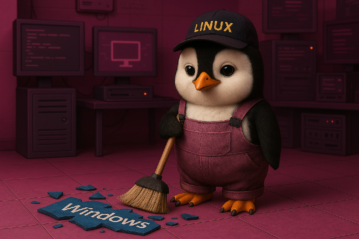 Erstelle ein FHD Wallpaper in Fotoqualität. Hintergrund ist ein Computerlabor. Farblich an die seite https://www.pinguin-tv.de/ angelehnt. Ein Pinguin, der eine Kappe mit der Aufschrift LINUX trägt und einen Arbeiteroverall trägt, wischt den Boden, auf dem Scherben durcheinander liegen mit der Aufschrift Windows.