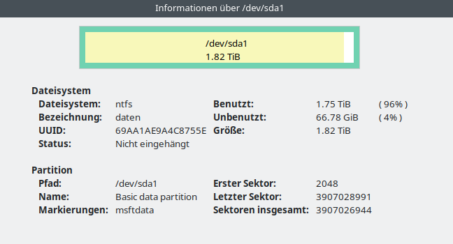 CodeBeim Zugriff auf „daten“ ist ein Fehler aufgetreten, die Meldung lautet: Die angegebene Operation ist fehlgeschlagen: Error mounting /dev/sda1 at /run/media/username/daten: fsconfig() failed: No such file or directoryEdit, das steht unter Infos im gparted: