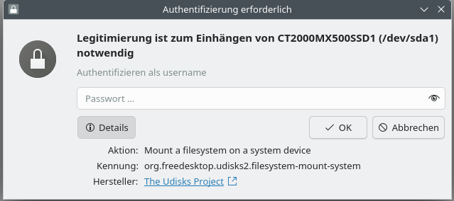 CodeBeim Zugriff auf „daten“ ist ein Fehler aufgetreten, die Meldung lautet: Die angegebene Operation ist fehlgeschlagen: Error mounting /dev/sda1 at /run/media/username/daten: fsconfig() failed: No such file or directoryIch habe kein Windows mehr installiert, sondern wie eingangs erwähnt, ausschließlich Arch Linux im Desktop PC aktiv.