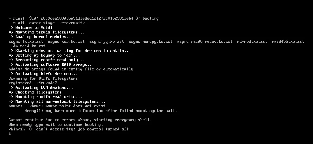 wenn du kein /home erstellen lässt, sollte da auch kein eintrag in der fstab sein