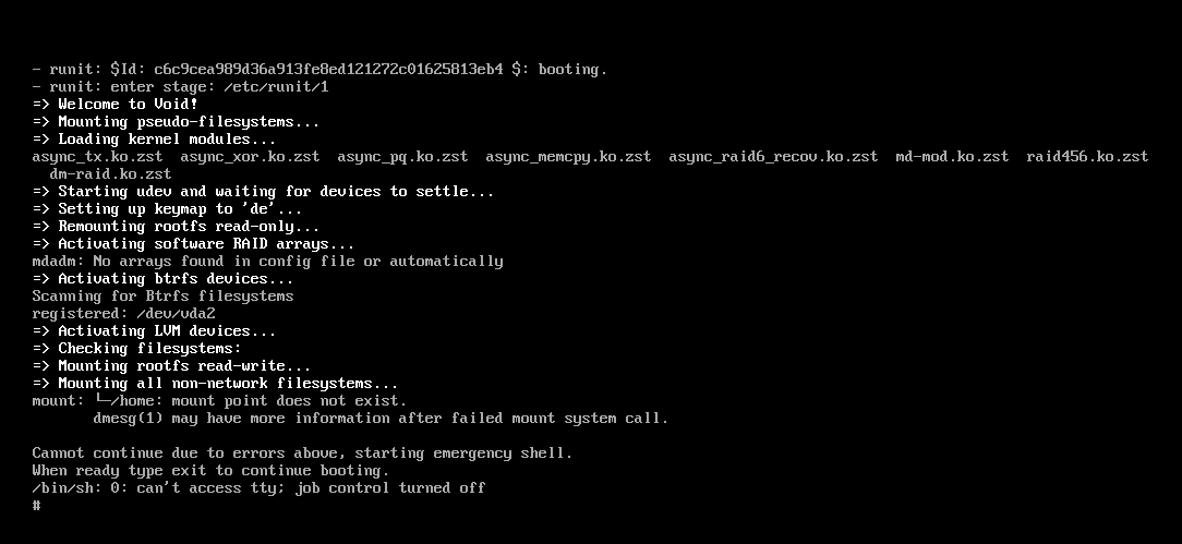 wenn du kein /home erstellen lässt, sollte da auch kein eintrag in der fstab sein