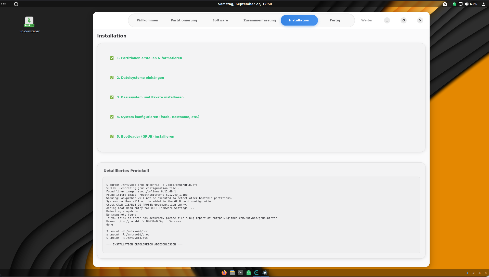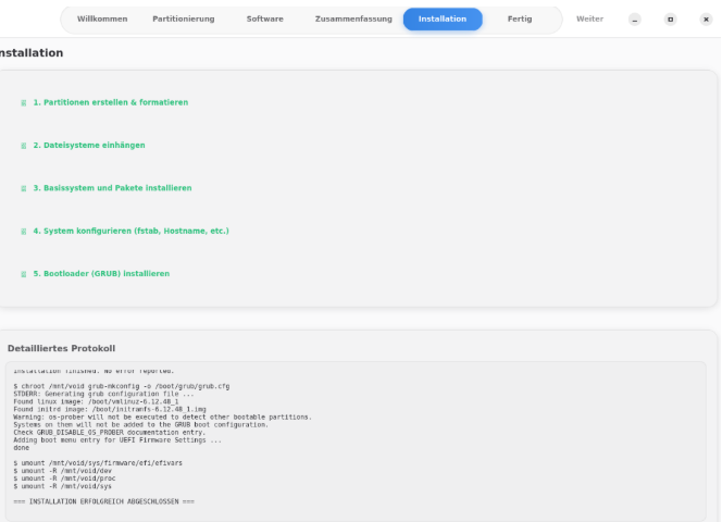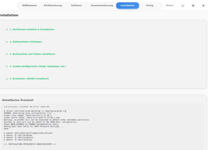 Hallo Armin, ich hatte heute ein bisschen Zeit und habe selber mal versucht, den vorherigen Installer zum Laufen zu bringen. Ich bin jetzt so weit, dass der Installer die Installation erfolgreich abschließt. Das System bootet jetzt erfolgreich. Einloggen kann ich mich aber noch nicht. Mal sehen, ob ich das auch noch hinbekomme … Die Änderungen habe ich mal auf Codeberg hochgeladen: https://codeberg.org/LinuxNation/void-installerDas ist von Maxi (LinuxNation)