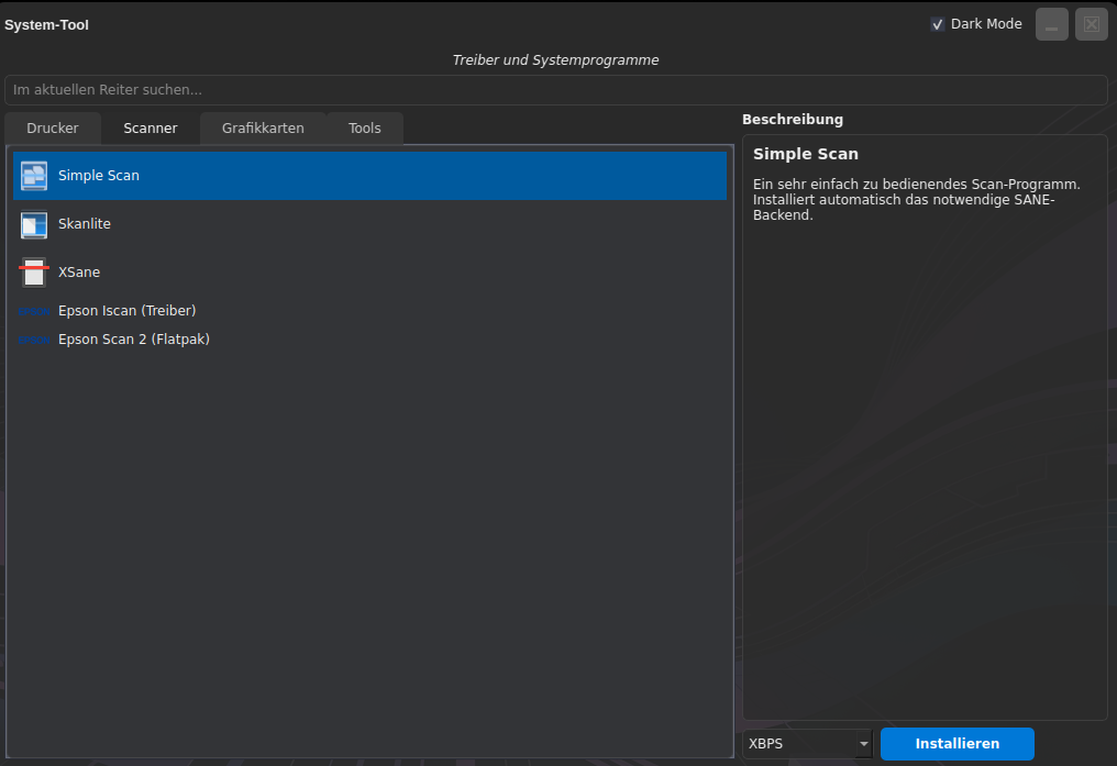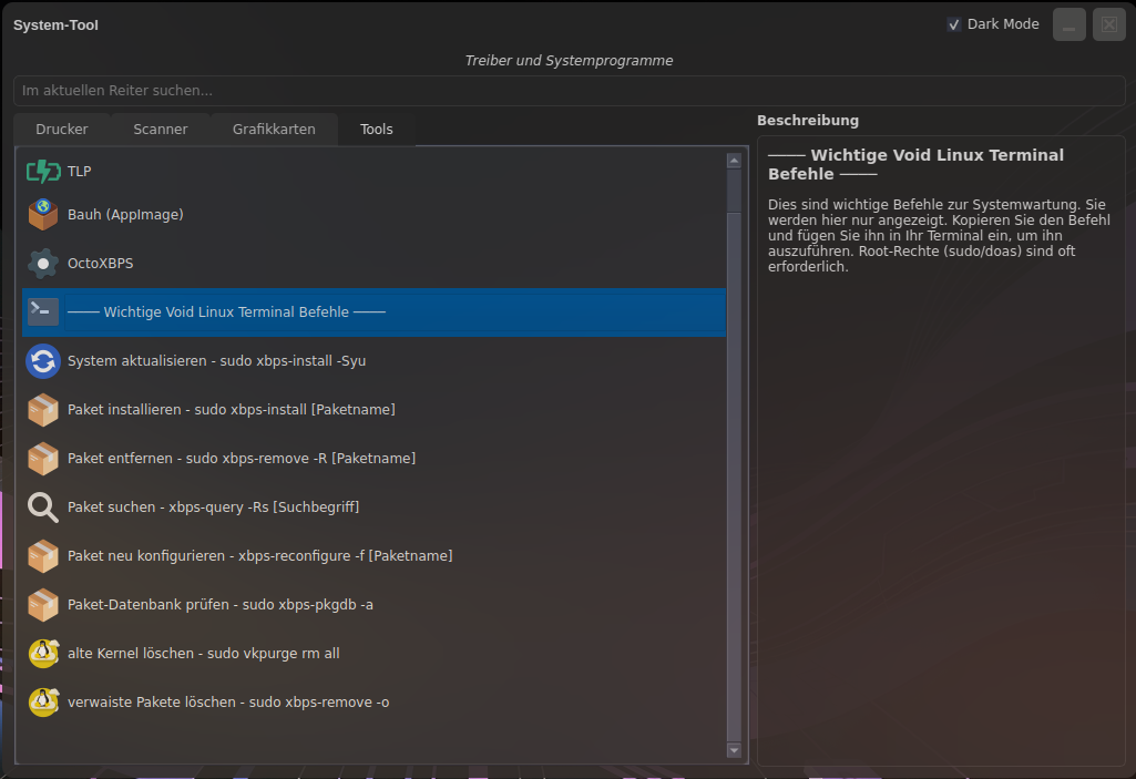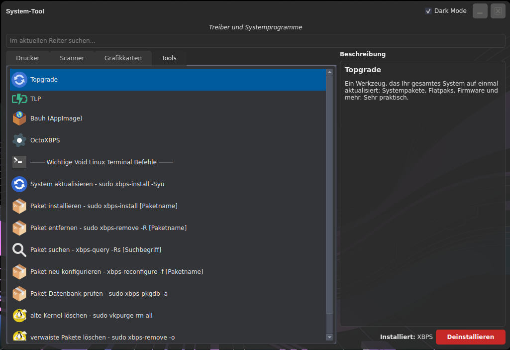 was will ich zukünftig machen? zuerstmal habe ich ja schon Bilder zu einem "Software-Tool" und einem "System-Tool" gezeigt, da kommt auch zu jedem ein Video, die sind für Void, da möchte ich gern weiter machen. Zur Zeit versuche ich das Software-Tool etwas besser zu machen und hoffe auch optisch etwas aufzuwerten, Ideen habe ich viele, von einem Begrüßungsfenster von dem man die Installation ausführen kann, genauso wie Treiber und Software installieren kann, da wird es aber noch mehr geben. Bitte so vorstellen, das das Begrüßungsfenster so eine Art Start für alle Tools wird, also nur so ein willkommen und ein paar Icons, das soll zwar schön aber einfach aussehen, ohne das es einem erschlägt und ohne zu sehen was dann eigentlich dahinter kommt oder steckt, dann kommt ein Tool (vielleicht nur für Void) das Flatpak, snap und webapps kann, also suchen installieren und löschen und und und.