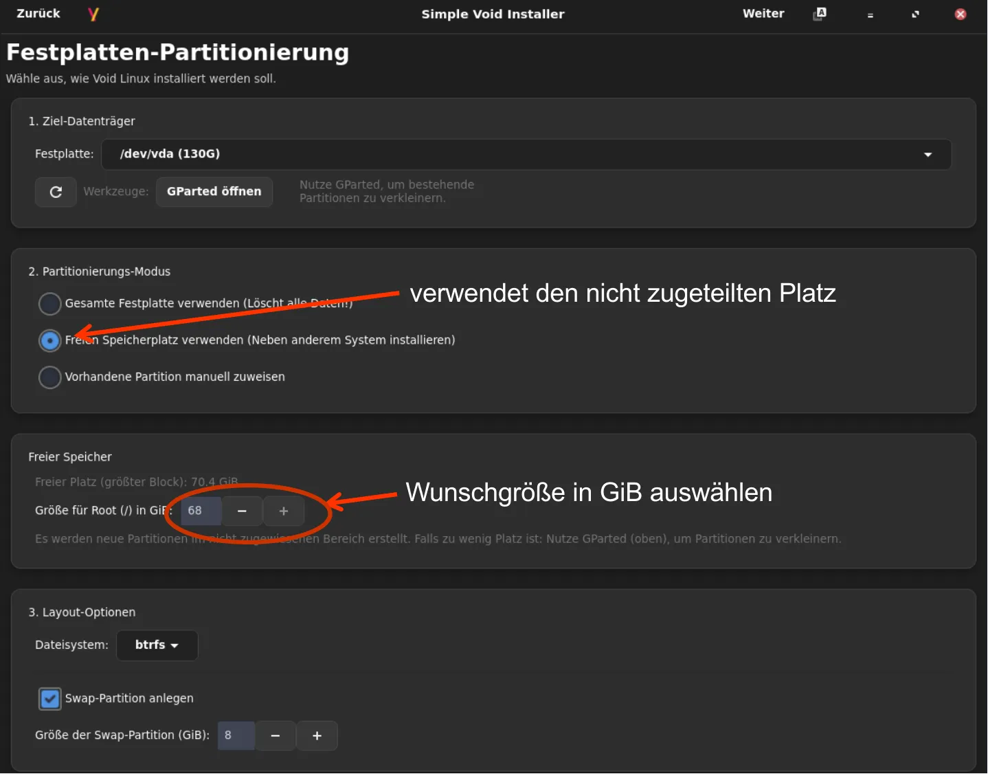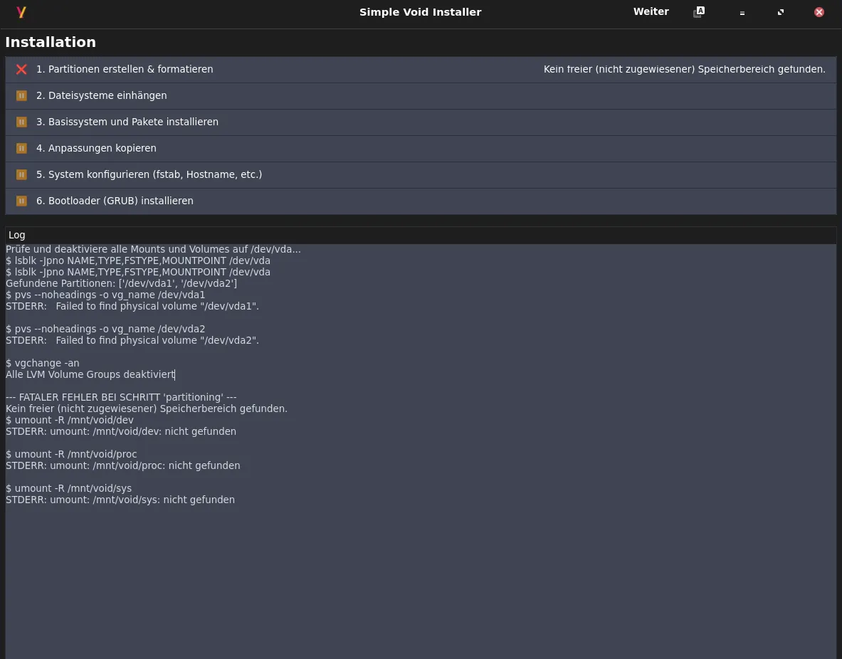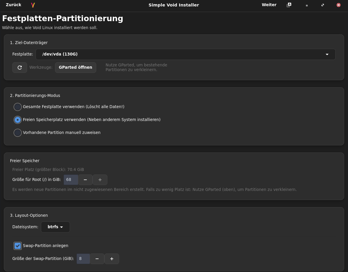 Und schon habe ich Deine ISO void-installer-2026.13 auf echter Hardware ausgetestet. Dazu habe ich einen Bereich auf meinem Backup-Laufwerk (externes SSD-Laufwerk mit USB-C angebunden) freigemacht.