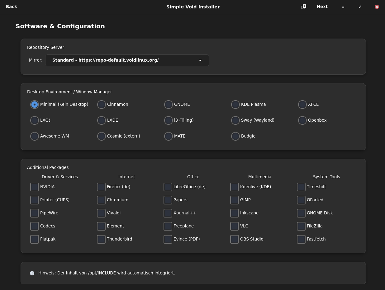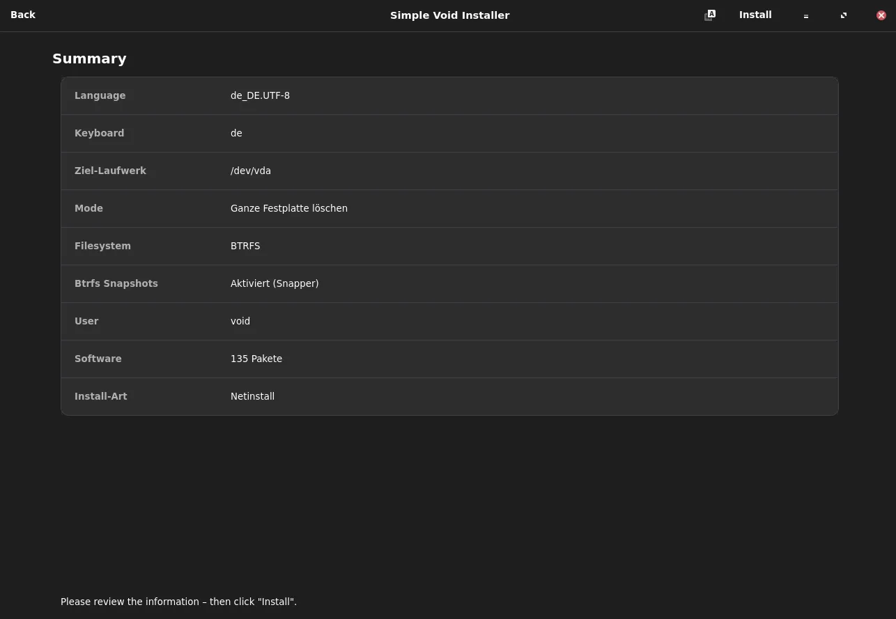 ich hätte die Installer-Iso gerne getestet. Aber leider ist das mit Cinnamon bei mir nicht möglich. Die Installation startet normal bis zum schwarzen Bildschirm und Mauszeiger. Eine zweite Konsole lässt sich aber öffnen, und man kann void-installer eingeben. Das bringt aber leider nichts. Bei Gnome oder Xfce würde eine Installation bestimmt erfolgreich sein.