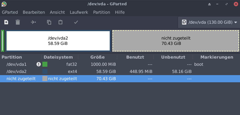 , was oder warum - muss ich probieren, ich habe noch keine Ahnung, es ist durch aus möglich das es wieder ein Übersetzungsfehler ist, das doofe ist das die die Partition eigentlich nur englisch kennt, also du kannst Gparted ruhig auf deutsch einstellen die Partitionierung bleibt immer im original, aber meine doofe Übersetzung macht aus einem englischen Punkt gerne ein deutsches Komma.du könntest folgendes probieren, den Installer auf englisch lassen und das ganze nochmal probieren,