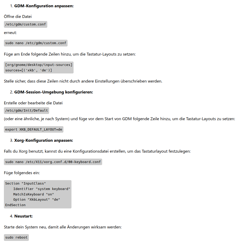 Ein Beispiel hier aus dem Forum ist auch zu köstlich. So habe ich Deepseek gefragt, warum nach der Installation gdm einfach keine deutsche Tastatur haben will, obwohl bei der Installation alles richtig gesetzt ist. Dazu habe ich Deepseek gesagt, dass es sich um Void Linux handelt, der Display Manager gdm und der Desktop Gnome ist.
