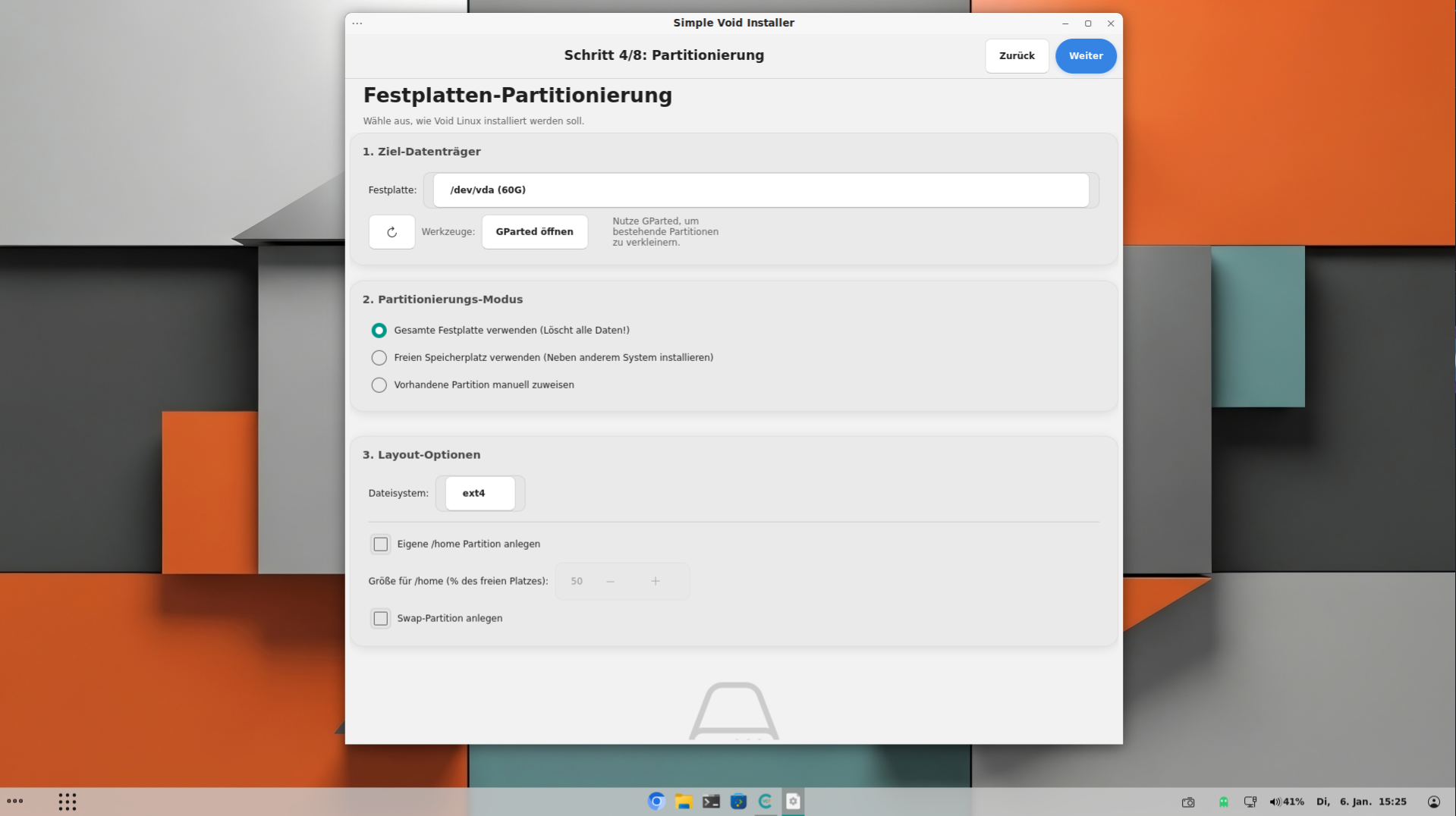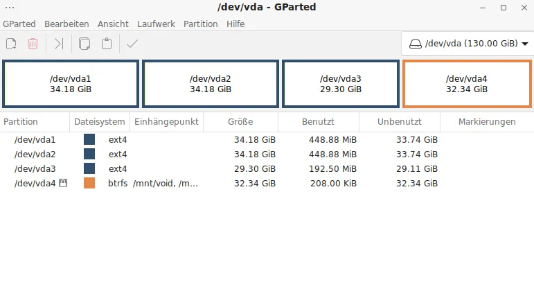 Ich habe jetzt den "einfachen" Installer noch etwas erweitert, der ist nur für Live-ISO's gedacht um die so wie die ISO ist zu installieren, ohne Software oder Desktop-Auswahl, der kann jetzt auch mit Partitionen umgehen - gemacht habe ich das jetzt nur wegen einer Entwicklerin die den Cosmic-Desktop und dann auch eine ISO für Void (oder mit Void) erstellt.