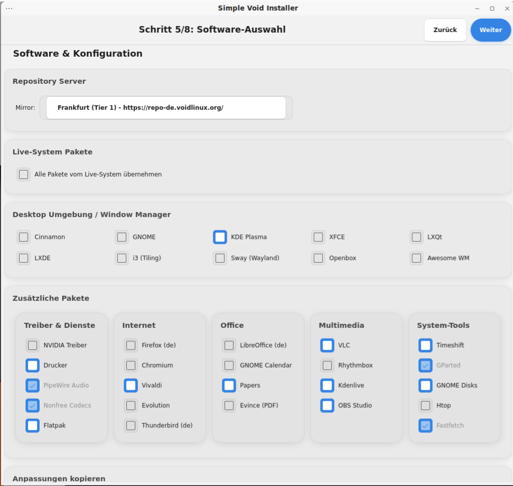 Danach werde ich eine ISO mit irgendwas als Desktop erstellen und den Installer mit der Auswahl erstellen, dann bin ich gespannt......