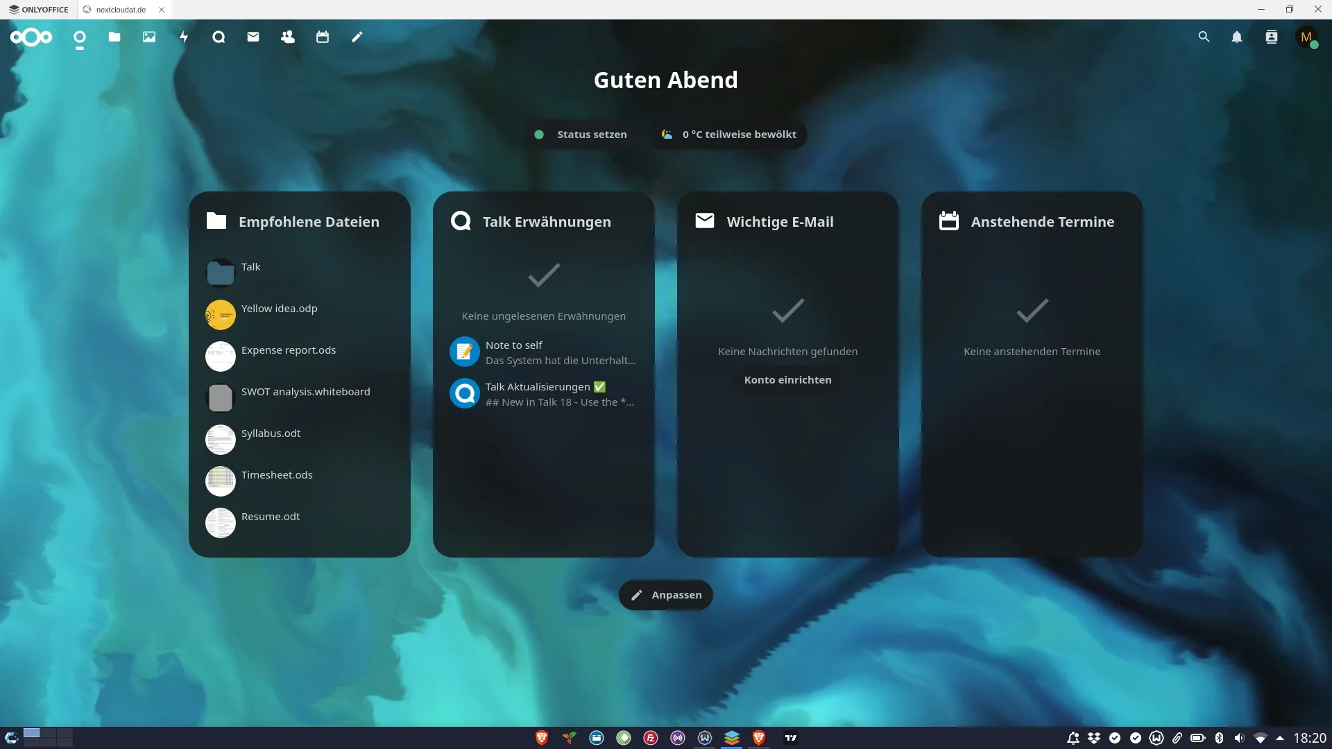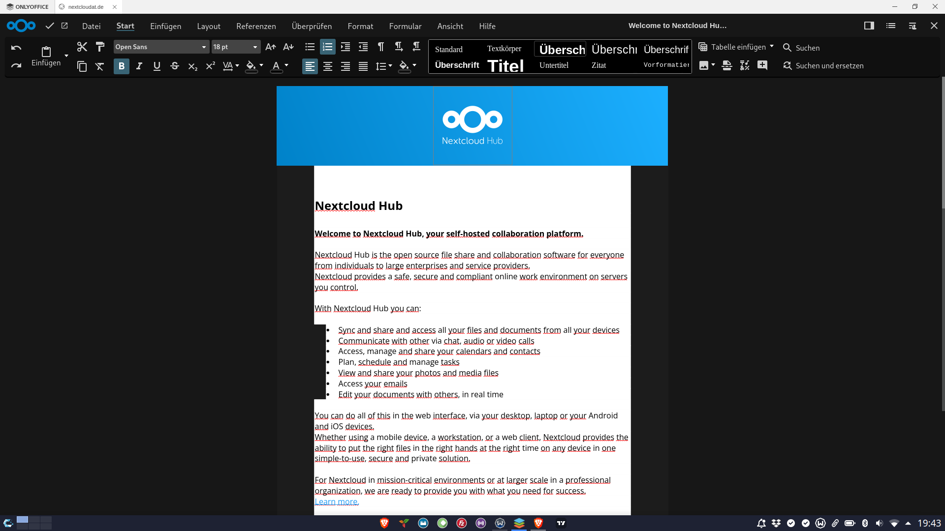 Ja, jetzt funktioniert es mit beiden, der Nexcloud und dem OnlyOffice Textprogramm. Heute schaffe ich es nicht mehr, alles einzurichten. Aber es sieht schon mal gut aus. Vielleicht wird dies mein open source Office, wo ich alles vorbereite und einpflege. Talk habe ich noch nicht ganz verstanden. Und das mit den Ringen. Vielleicht kommen wir da als Gruppe im Talk zusammen. Vielleicht könnten wir so tatsächlich eine Distro herausbringen oder andere Dinge tun.