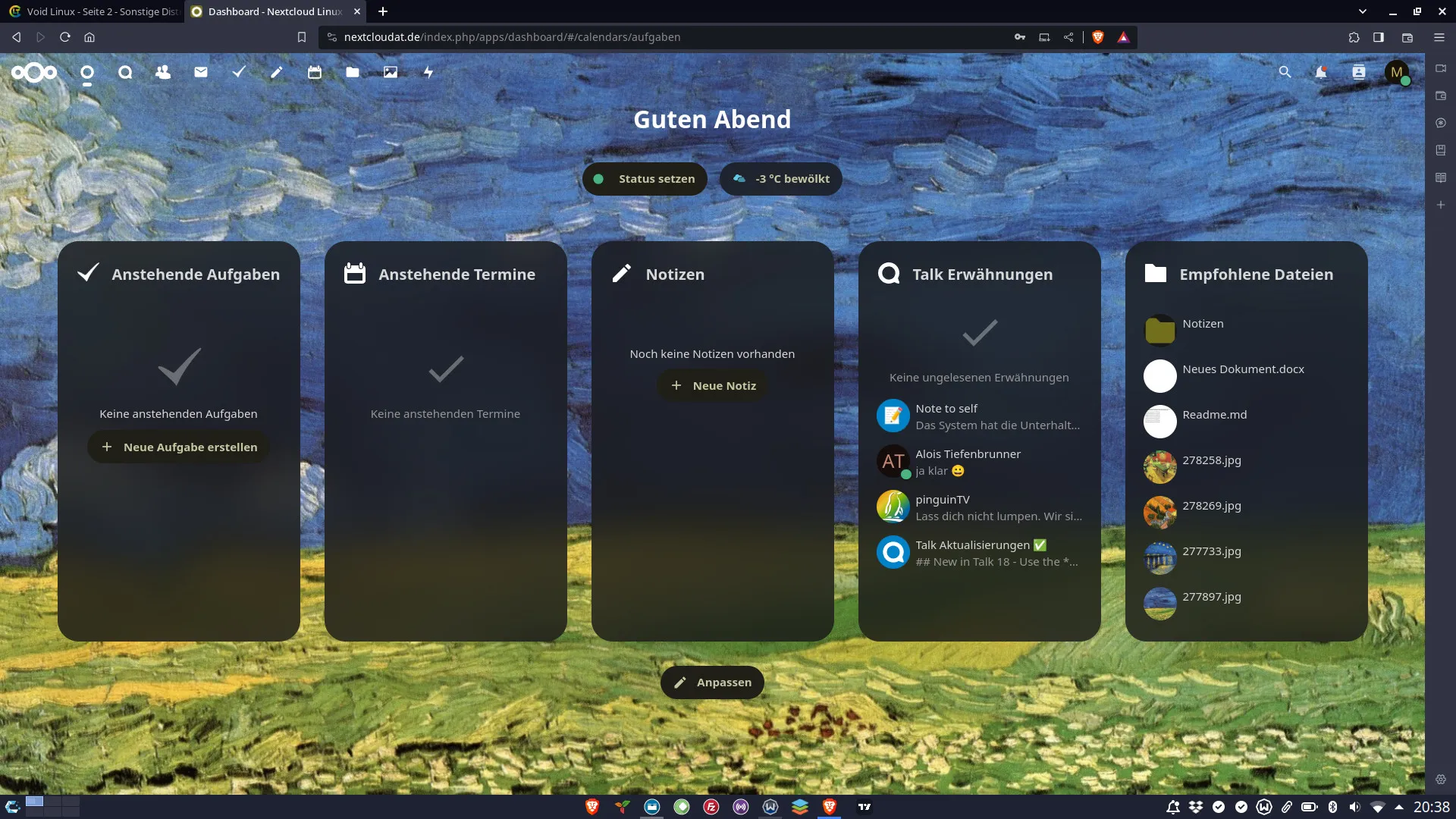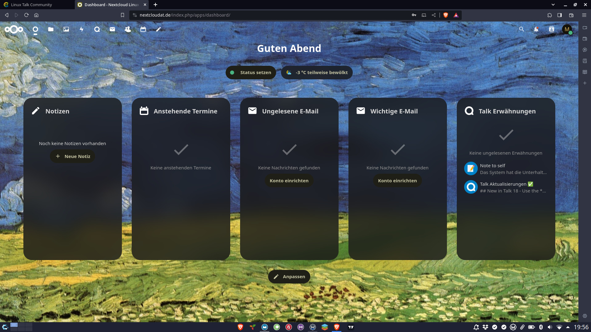 Habe mir zusätzlich nun die Dritte Nextcloud installiert. Jetzt verlasse ich Google, aber Youtube, da muss ich doch wieder auf den Rechner aus California. Dieses Wochenende versuche ich allen bye bye zu sagen. Also den sozialen Netzwerken und Google.