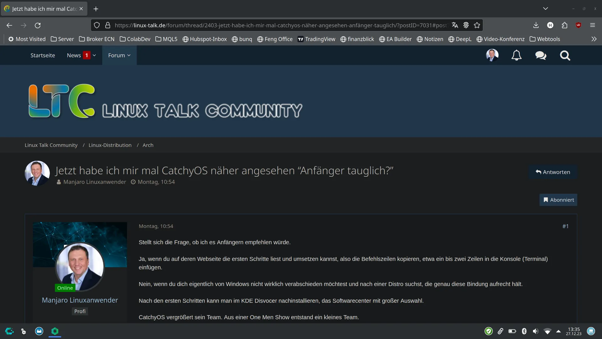 Ich empfehle dir gleich mit Manjaro anzufangen. Ich persönlich halte es nicht für sehr hilfreich, wenn man nach einer Distro sucht, die den unerfahrenen abholen, weil man da auch nicht soviel lernt. Und alle Distros haben ihre Berechtigung. Ich hatte Anfängern openSUSE installiert und sie kamen klar. Auch meiner Stieftochter Manjaro und siehe da, wenn sie ein Problem erkennt, versucht sie es zu lösen. Letztes mal schaute sie nach dem Netzwerk, weil kein Internet. Lag aber daran, dass ich einen Teppich verlegt hatte und das Kabel löste und verpasste es wieder anzustecken. Überrascht war ich, dass sie die richtigen Fenster öffnete.